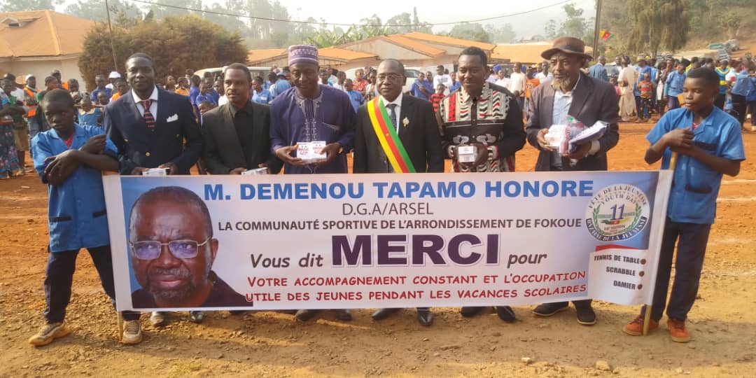 – tournois de tennis de table, scrabble et Damier, de l’Association Sportivement KAMDJOUG MAKAMKEU Véronique (AS-KMV) du DGA ARSEL DEMENOU TAPAMO Honoré par ailleurs président de la Section RDPC Menoua Sud-Est qui était accompagné ce jour du président National de la Fédération Camerounaise du Tennis de Table BAGUEKA ASSOBO Alfred, qui en plus de son soutien à l’AS-KMV dans la vulgarisation du tennis de table dans la commune de Fokoué, n’est pas venu les mains vides: le Haut commis de l’Etat, ancien Directeur Général des impôts et ancien Directeur Général de COTCO a mis à la disposition des populations de Fokoué une table olympique de tennis de table des balles…